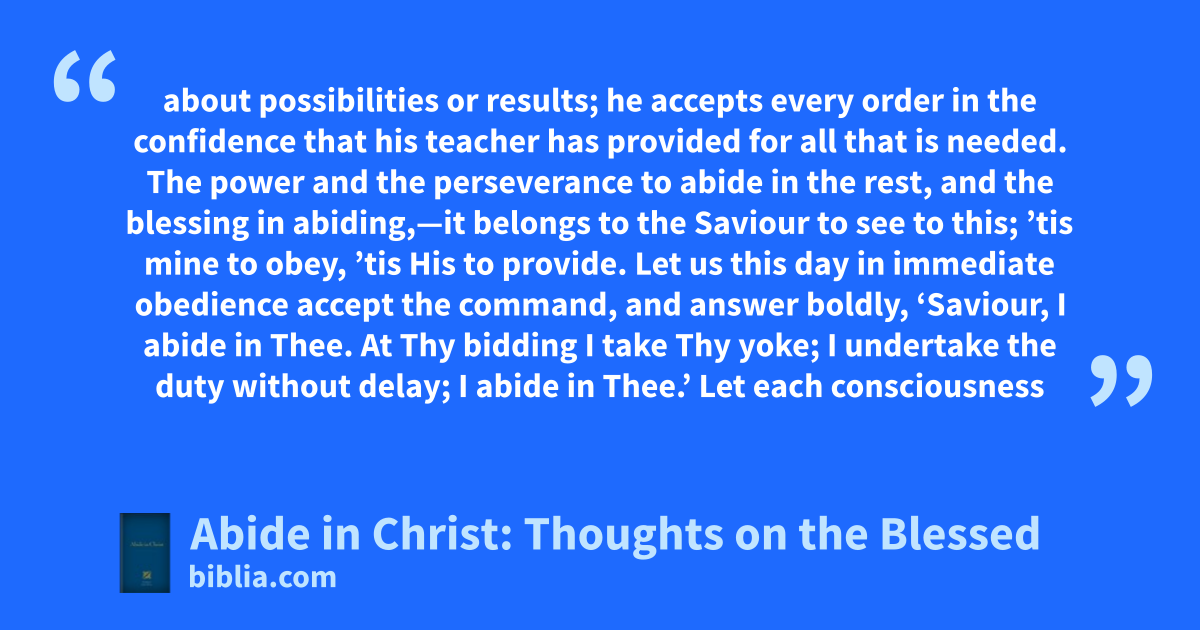about possibilities or results; he accepts every order in the confidence that his teacher has provided for all that is needed. The power and the perseverance to abide in the rest, and the blessing in abiding,—it belongs to the Saviour to see to this; ’tis mine to obey, ’tis His to provide. Let us this day in immediate obedience accept the command, and answer boldly, ‘Saviour, I abide in Thee. At Thy bidding I take Thy yoke; I undertake the duty without delay; I abide in Thee.’ Let each consciousness