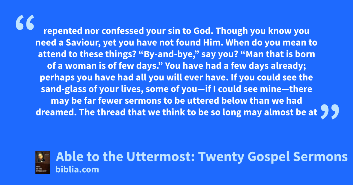 repented nor confessed your sin to God. Though you know you need a Saviour, yet you have not found Him. When do you mean to attend to these things? “By-and-bye,” say you? “Man that is born of a woman is of few days.” You have had a few days already; perhaps you have had all you will ever have. If you could see the sand-glass of your lives, some of you—if I could see mine—there may be far fewer sermons to be uttered below than we had dreamed. The thread that we think to be so long may almost be at