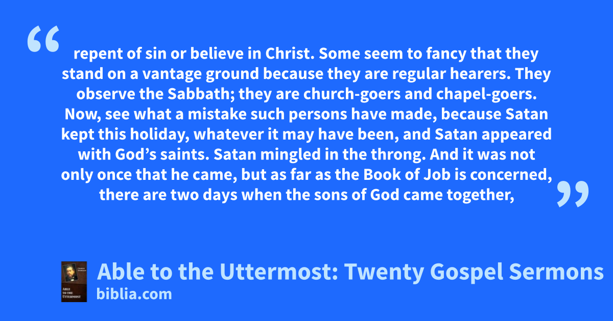 repent of sin or believe in Christ. Some seem to fancy that they stand on a vantage ground because they are regular hearers. They observe the Sabbath; they are church-goers and chapel-goers. Now, see what a mistake such persons have made, because Satan kept this holiday, whatever it may have been, and Satan appeared with God’s saints. Satan mingled in the throng. And it was not only once that he came, but as far as the Book of Job is concerned, there are two days when the sons of God came together,