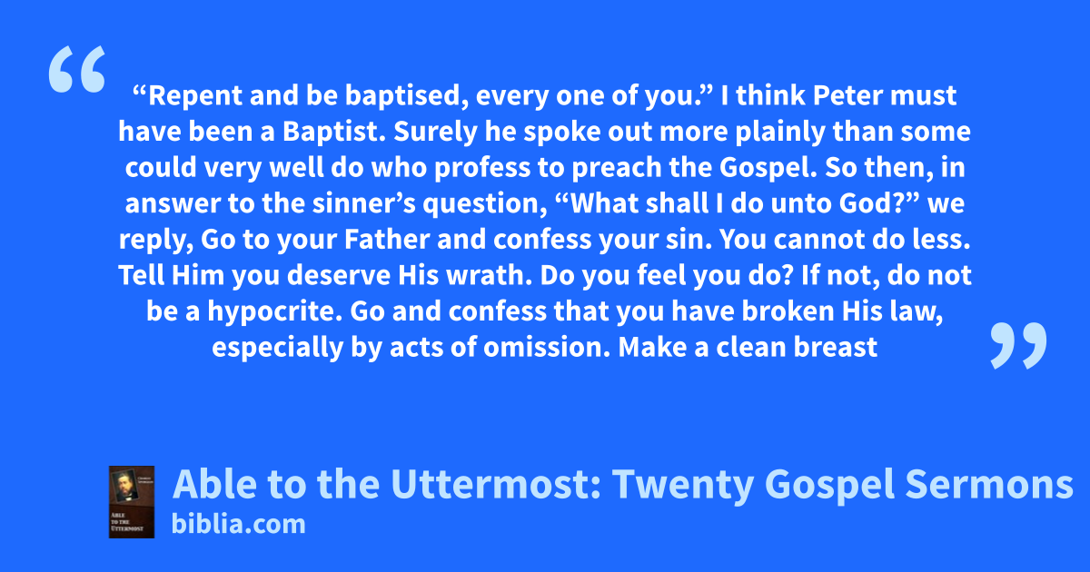 “Repent and be baptised, every one of you.” I think Peter must have been a Baptist. Surely he spoke out more plainly than some could very well do who profess to preach the Gospel. So then, in answer to the sinner’s question, “What shall I do unto God?” we reply, Go to your Father and confess your sin. You cannot do less. Tell Him you deserve His wrath. Do you feel you do? If not, do not be a hypocrite. Go and confess that you have broken His law, especially by acts of omission. Make a clean breast
