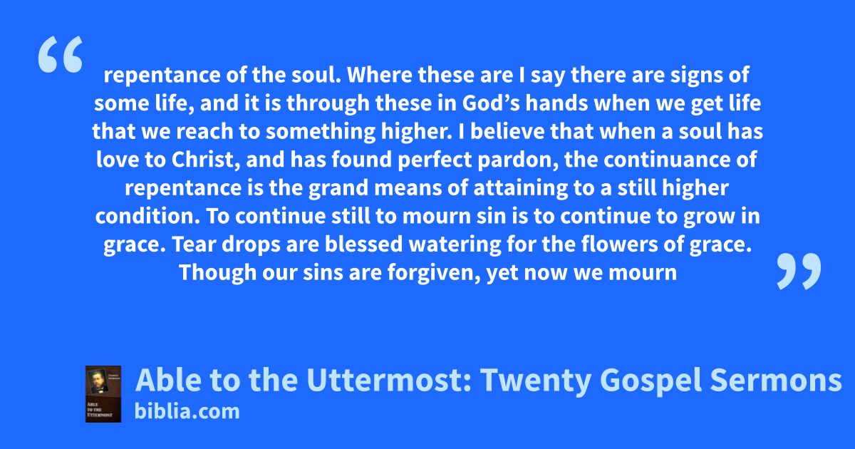 repentance of the soul. Where these are I say there are signs of some life, and it is through these in God’s hands when we get life that we reach to something higher. I believe that when a soul has love to Christ, and has found perfect pardon, the continuance of repentance is the grand means of attaining to a still higher condition. To continue still to mourn sin is to continue to grow in grace. Tear drops are blessed watering for the flowers of grace. Though our sins are forgiven, yet now we mourn