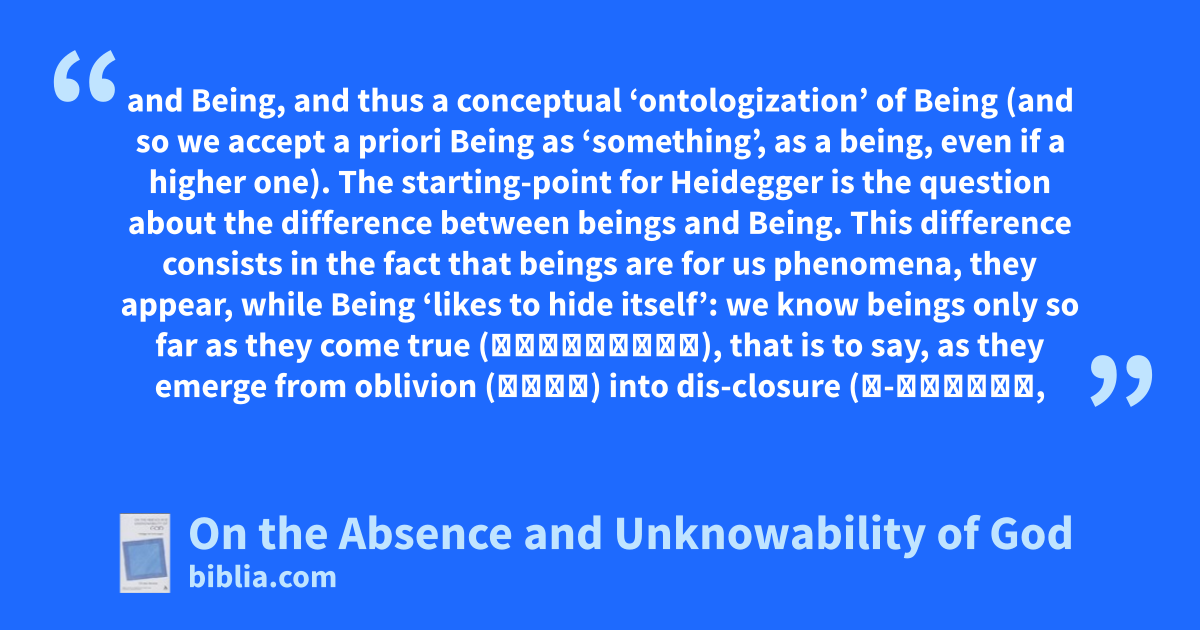 and Being, and thus a conceptual ‘ontologization’ of Being (and so we accept a priori Being as ‘something’, as a being, even if a higher one). The starting-point for Heidegger is the question about the difference between beings and Being. This difference consists in the fact that beings are for us phenomena, they appear, while Being ‘likes to hide itself’: we know beings only so far as they come true (ἀληθεύουν), that is to say, as they emerge from oblivion (λήθη) into dis-closure (ἀ-λήθεια,