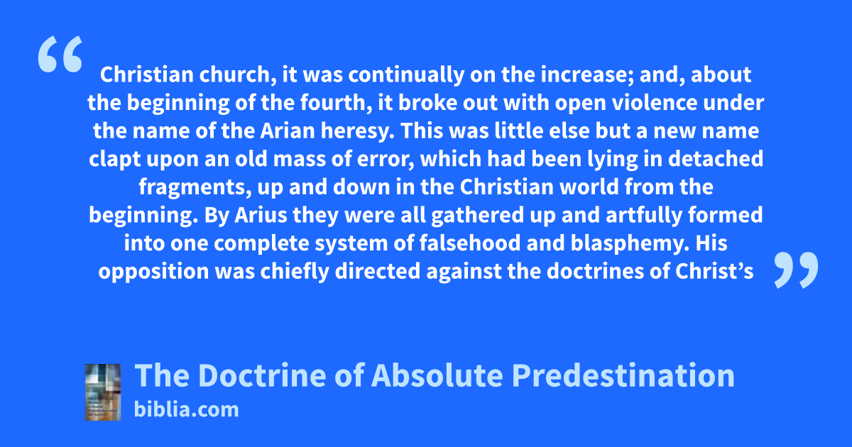 Christian church, it was continually on the increase; and, about the beginning of the fourth, it broke out with open violence under the name of the Arian heresy. This was little else but a new name clapt upon an old mass of error, which had been lying in detached fragments, up and down in the Christian world from the beginning. By Arius they were all gathered up and artfully formed into one complete system of falsehood and blasphemy. His opposition was chiefly directed against the doctrines of Christ’s