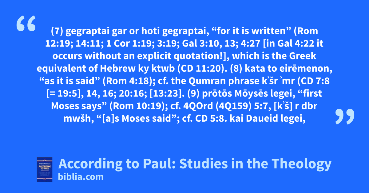 (7) gegraptai gar or hoti gegraptai, “for it is written” (Rom 12:19; 14:11; 1 Cor 1:19; 3:19; Gal 3:10, 13; 4:27 [in Gal 4:22 it occurs without an explicit quotation!], which is the Greek equivalent of Hebrew ky ktwb (CD 11:20). (8) kata to eirēmenon, “as it is said” (Rom 4:18); cf. the Qumran phrase kʾšr ʾmr (CD 7:8 [= 19:5], 14, 16; 20:16; [13:23]. (9) prōtōs Mōysēs legei, “first Moses says” (Rom 10:19); cf. 4QOrd (4Q159) 5:7, [kʾš] r dbr mwšh, “[a]s Moses said”; cf. CD 5:8. kai Daueid legei,
