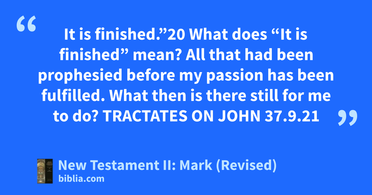 It is finished.”20 What does “It is finished” mean? All that had been prophesied before my passion has been fulfilled. What then is there still for me to do? TRACTATES ON JOHN 37.9.21
