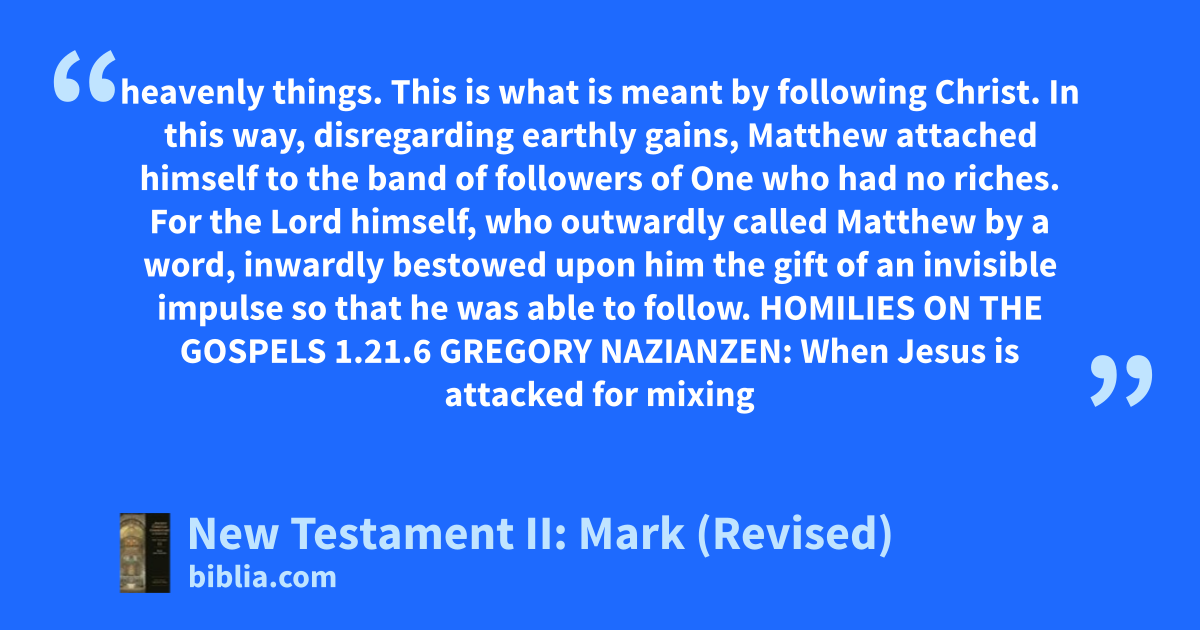 heavenly things. This is what is meant by following Christ. In this way, disregarding earthly gains, Matthew attached himself to the band of followers of One who had no riches. For the Lord himself, who outwardly called Matthew by a word, inwardly bestowed upon him the gift of an invisible impulse so that he was able to follow. HOMILIES ON THE GOSPELS 1.21.6 GREGORY NAZIANZEN: When Jesus is attacked for mixing