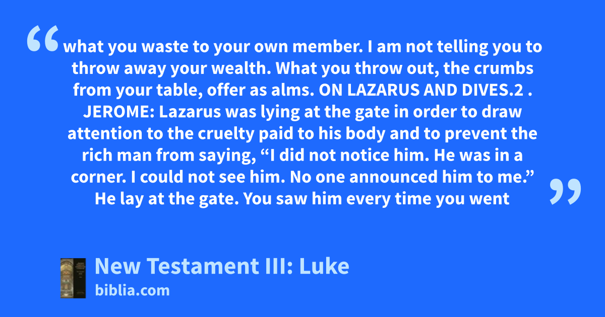 what you waste to your own member. I am not telling you to throw away your wealth. What you throw out, the crumbs from your table, offer as alms. ON LAZARUS AND DIVES.2 . JEROME: Lazarus was lying at the gate in order to draw attention to the cruelty paid to his body and to prevent the rich man from saying, “I did not notice him. He was in a corner. I could not see him. No one announced him to me.” He lay at the gate. You saw him every time you went