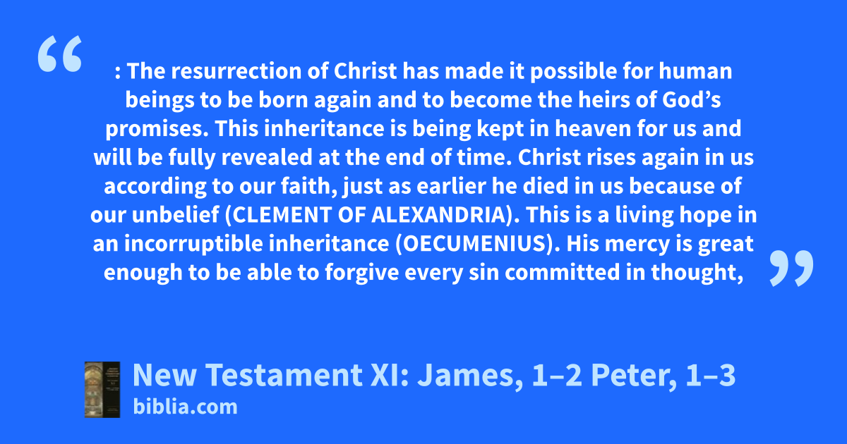 : The resurrection of Christ has made it possible for human beings to be born again and to become the heirs of God’s promises. This inheritance is being kept in heaven for us and will be fully revealed at the end of time. Christ rises again in us according to our faith, just as earlier he died in us because of our unbelief (CLEMENT OF ALEXANDRIA). This is a living hope in an incorruptible inheritance (OECUMENIUS). His mercy is great enough to be able to forgive every sin committed in thought,