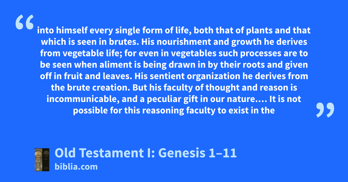 into himself every single form of life, both that of plants and that which is seen in brutes. His nourishment and growth he derives from vegetable life; for even in vegetables such processes are to be seen when aliment is being drawn in by their roots and given off in fruit and leaves. His sentient organization he derives from the brute creation. But his faculty of thought and reason is incommunicable, and a peculiar gift in our nature.… It is not possible for this reasoning faculty to exist in the