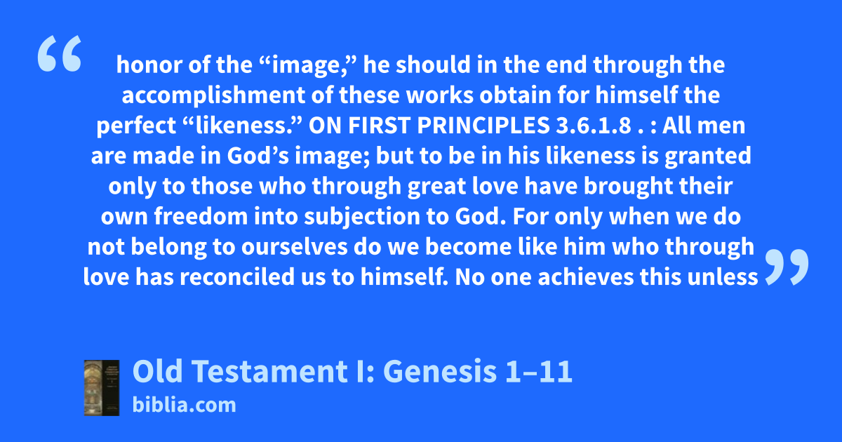 honor of the “image,” he should in the end through the accomplishment of these works obtain for himself the perfect “likeness.” ON FIRST PRINCIPLES 3.6.1.8 . : All men are made in God’s image; but to be in his likeness is granted only to those who through great love have brought their own freedom into subjection to God. For only when we do not belong to ourselves do we become like him who through love has reconciled us to himself. No one achieves this unless