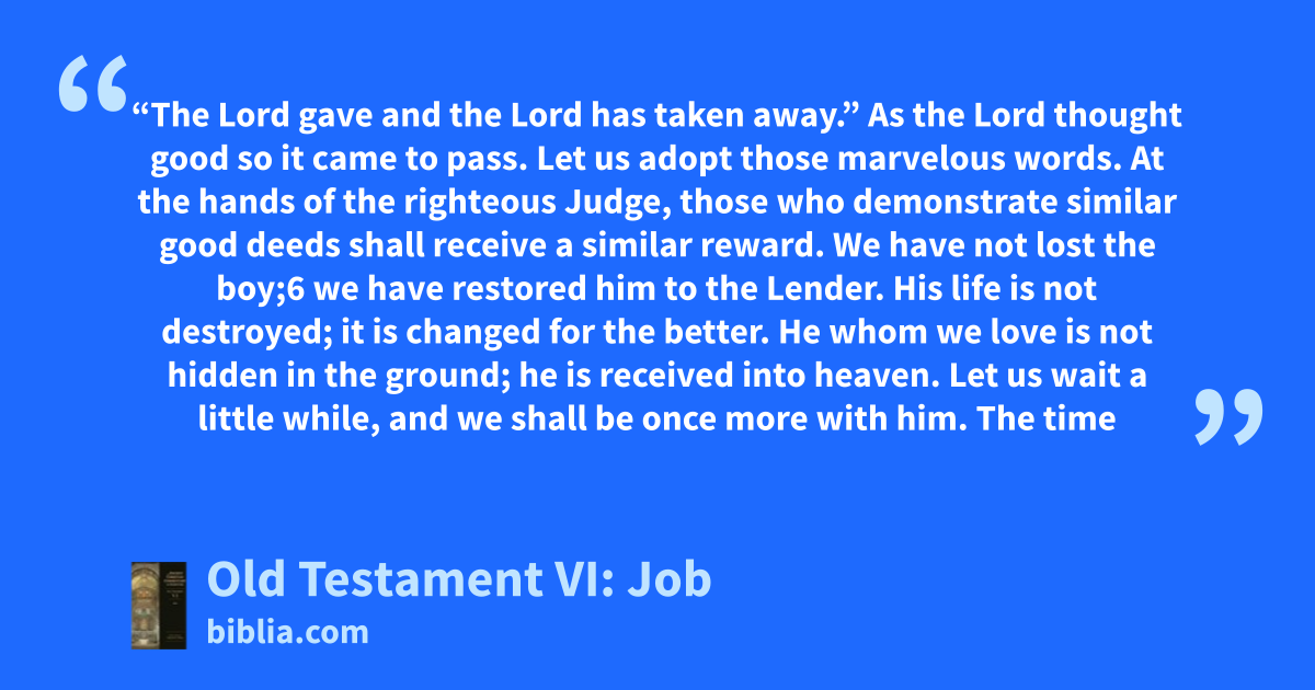 “The Lord gave and the Lord has taken away.” As the Lord thought good so it came to pass. Let us adopt those marvelous words. At the hands of the righteous Judge, those who demonstrate similar good deeds shall receive a similar reward. We have not lost the boy;6 we have restored him to the Lender. His life is not destroyed; it is changed for the better. He whom we love is not hidden in the ground; he is received into heaven. Let us wait a little while, and we shall be once more with him. The time