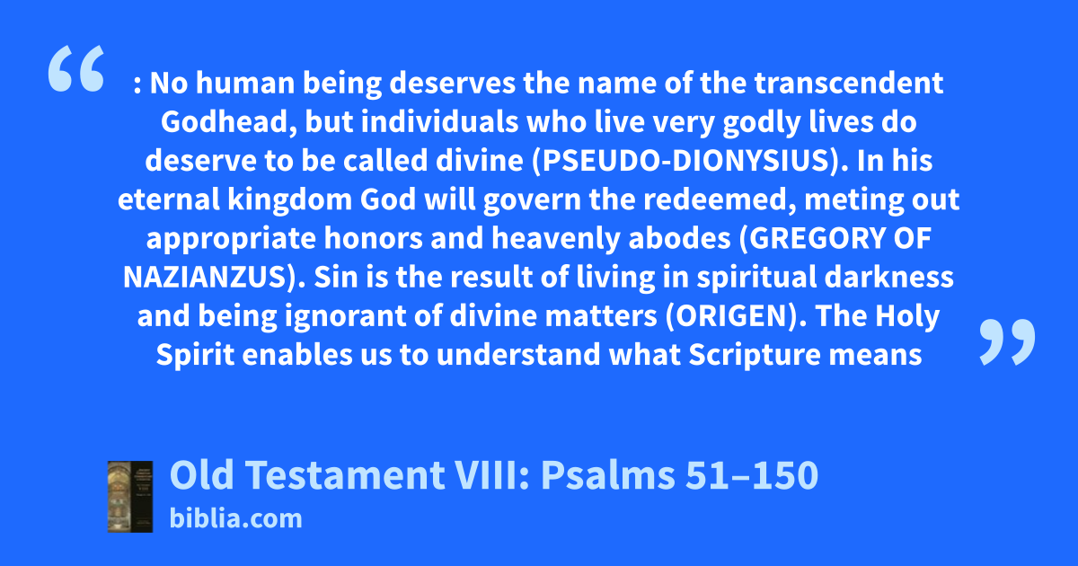 : No human being deserves the name of the transcendent Godhead, but individuals who live very godly lives do deserve to be called divine (PSEUDO-DIONYSIUS). In his eternal kingdom God will govern the redeemed, meting out appropriate honors and heavenly abodes (GREGORY OF NAZIANZUS). Sin is the result of living in spiritual darkness and being ignorant of divine matters (ORIGEN). The Holy Spirit enables us to understand what Scripture means