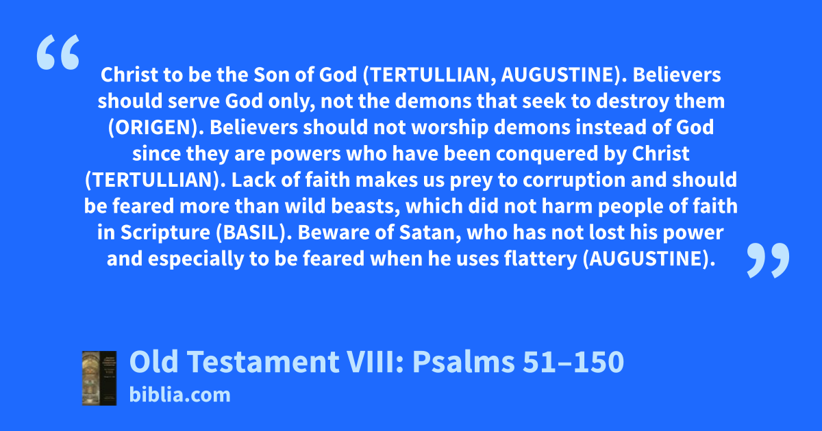 Christ to be the Son of God (TERTULLIAN, AUGUSTINE). Believers should serve God only, not the demons that seek to destroy them (ORIGEN). Believers should not worship demons instead of God since they are powers who have been conquered by Christ (TERTULLIAN). Lack of faith makes us prey to corruption and should be feared more than wild beasts, which did not harm people of faith in Scripture (BASIL). Beware of Satan, who has not lost his power and especially to be feared when he uses flattery (AUGUSTINE).