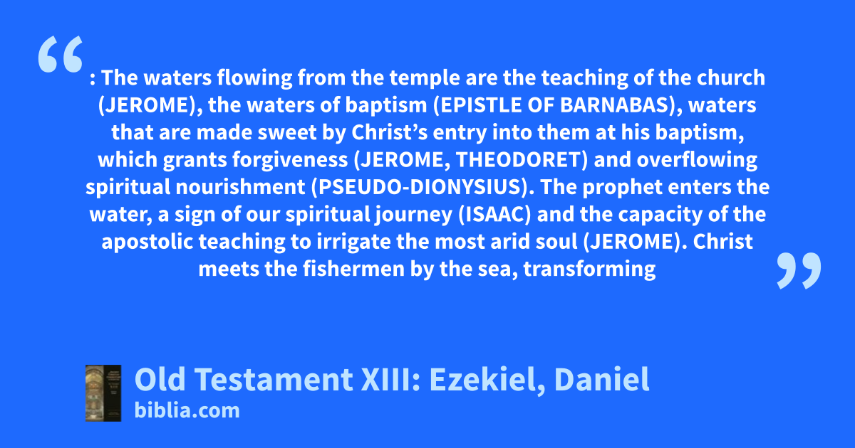 : The waters flowing from the temple are the teaching of the church (JEROME), the waters of baptism (EPISTLE OF BARNABAS), waters that are made sweet by Christ’s entry into them at his baptism, which grants forgiveness (JEROME, THEODORET) and overflowing spiritual nourishment (PSEUDO-DIONYSIUS). The prophet enters the water, a sign of our spiritual journey (ISAAC) and the capacity of the apostolic teaching to irrigate the most arid soul (JEROME). Christ meets the fishermen by the sea, transforming