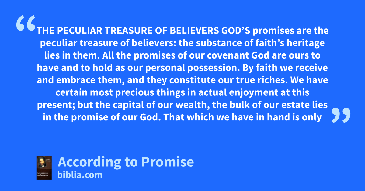 THE PECULIAR TREASURE OF BELIEVERS GOD’S promises are the peculiar treasure of believers: the substance of faith’s heritage lies in them. All the promises of our covenant God are ours to have and to hold as our personal possession. By faith we receive and embrace them, and they constitute our true riches. We have certain most precious things in actual enjoyment at this present; but the capital of our wealth, the bulk of our estate lies in the promise of our God. That which we have in hand is only