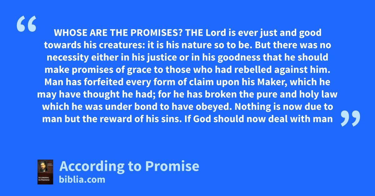 WHOSE ARE THE PROMISES? THE Lord is ever just and good towards his creatures: it is his nature so to be. But there was no necessity either in his justice or in his goodness that he should make promises of grace to those who had rebelled against him. Man has forfeited every form of claim upon his Maker, which he may have thought he had; for he has broken the pure and holy law which he was under bond to have obeyed. Nothing is now due to man but the reward of his sins. If God should now deal with man