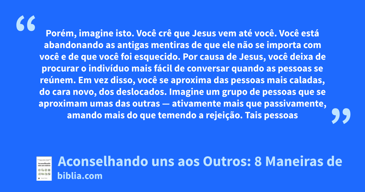 BÍBLICO, PRÁTICO, SÁBIO Imagine um grupo interconectado de pessoas que confiam umas nas outras. Você pode falar de sua dor, e alguém responde com compaixão. Você pode falar de suas alegrias, e alguém se regozija com você. Você pode pedir ajuda em sua luta contra o pecado, e alguém ora com você. Há franqueza, liberdade, amizade; os fardos são compartilhados. Nada de conselhos banais. E Jesus está...