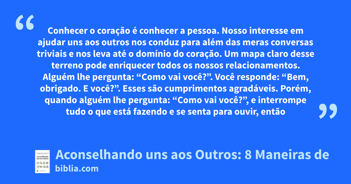 Conhecer o coração é conhecer a pessoa. Nosso interesse em ajudar uns aos outros nos conduz para além das meras conversas triviais e nos leva até o domínio do coração. Um mapa claro desse terreno pode enriquecer todos os nossos relacionamentos. Alguém lhe pergunta: “Como vai você?”. Você responde: “Bem, obrigado. E você?”. Esses são cumprimentos agradáveis. Porém, quando alguém lhe pergunta: “Como vai você?”, e interrompe tudo o que está fazendo e se senta para ouvir, então