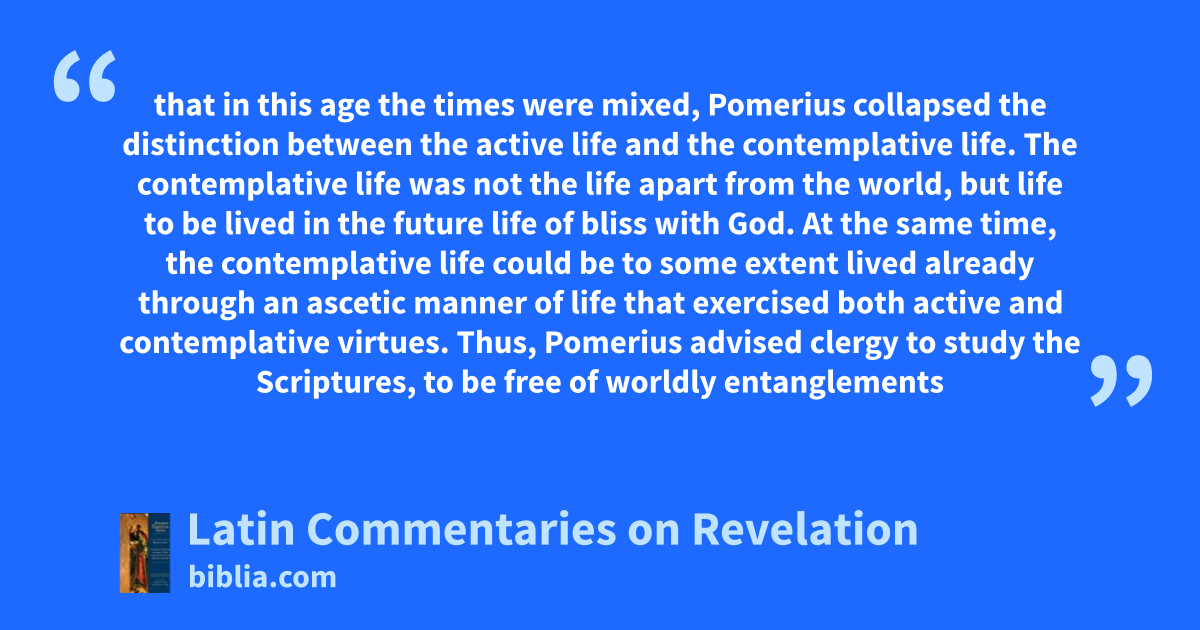 that in this age the times were mixed, Pomerius collapsed the distinction between the active life and the contemplative life. The contemplative life was not the life apart from the world, but life to be lived in the future life of bliss with God. At the same time, the contemplative life could be to some extent lived already through an ascetic manner of life that exercised both active and contemplative virtues. Thus, Pomerius advised clergy to study the Scriptures, to be free of worldly entanglements