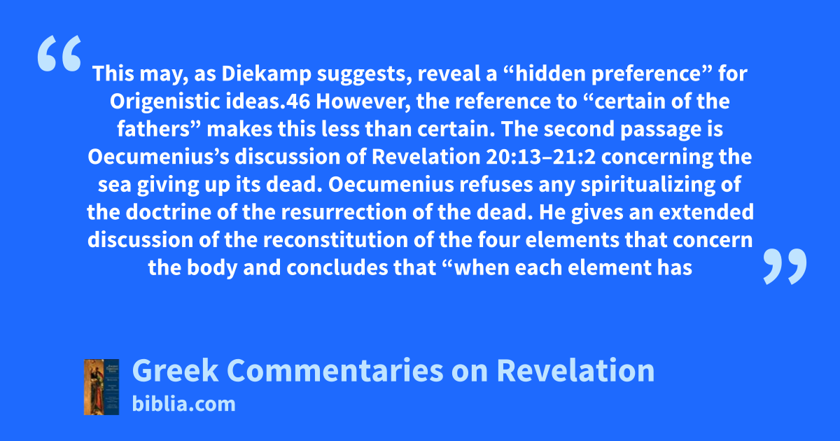 This may, as Diekamp suggests, reveal a “hidden preference” for Origenistic ideas.46 However, the reference to “certain of the fathers” makes this less than certain. The second passage is Oecumenius’s discussion of Revelation 20:13–21:2 concerning the sea giving up its dead. Oecumenius refuses any spiritualizing of the doctrine of the resurrection of the dead. He gives an extended discussion of the reconstitution of the four elements that concern the body and concludes that “when each element has