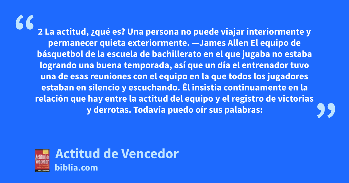 2 La actitud, ¿qué es? Una persona no puede viajar interiormente y permanecer quieta exteriormente. —James Allen El equipo de básquetbol de la escuela de bachillerato en el que jugaba no estaba logrando una buena temporada, así que un día el entrenador tuvo una de esas reuniones con el equipo en la que todos los jugadores estaban en silencio y escuchando. Él insistía continuamente en la relación que hay entre la actitud del equipo y el registro de victorias y derrotas. Todavía puedo oír sus palabras: