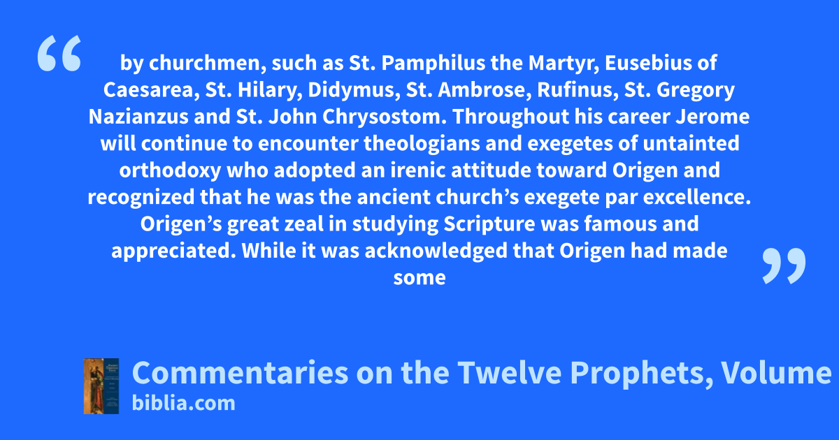 by churchmen, such as St. Pamphilus the Martyr, Eusebius of Caesarea, St. Hilary, Didymus, St. Ambrose, Rufinus, St. Gregory Nazianzus and St. John Chrysostom. Throughout his career Jerome will continue to encounter theologians and exegetes of untainted orthodoxy who adopted an irenic attitude toward Origen and recognized that he was the ancient church’s exegete par excellence. Origen’s great zeal in studying Scripture was famous and appreciated. While it was acknowledged that Origen had made some