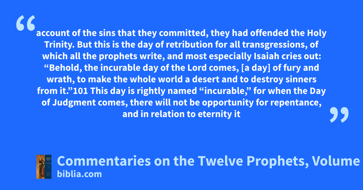 account of the sins that they committed, they had offended the Holy Trinity. But this is the day of retribution for all transgressions, of which all the prophets write, and most especially Isaiah cries out: “Behold, the incurable day of the Lord comes, [a day] of fury and wrath, to make the whole world a desert and to destroy sinners from it.”101 This day is rightly named “incurable,” for when the Day of Judgment comes, there will not be opportunity for repentance, and in relation to eternity it