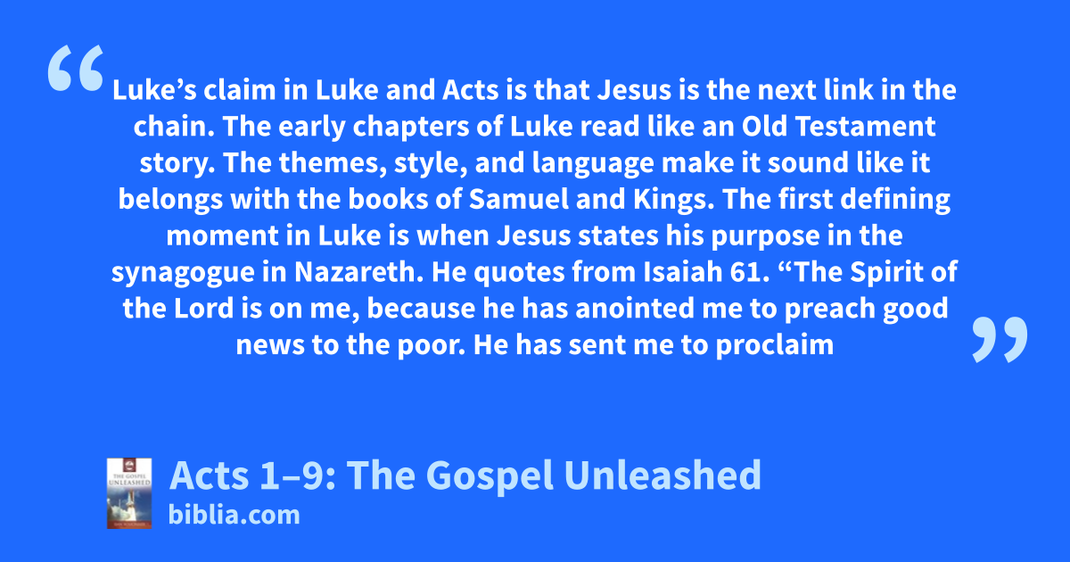 Luke’s claim in Luke and Acts is that Jesus is the next link in the chain. The early chapters of Luke read like an Old Testament story. The themes, style, and language make it sound like it belongs with the books of Samuel and Kings. The first defining moment in Luke is when Jesus states his purpose in the synagogue in Nazareth. He quotes from Isaiah 61. “The Spirit of the Lord is on me, because he has anointed me to preach good news to the poor. He has sent me to proclaim