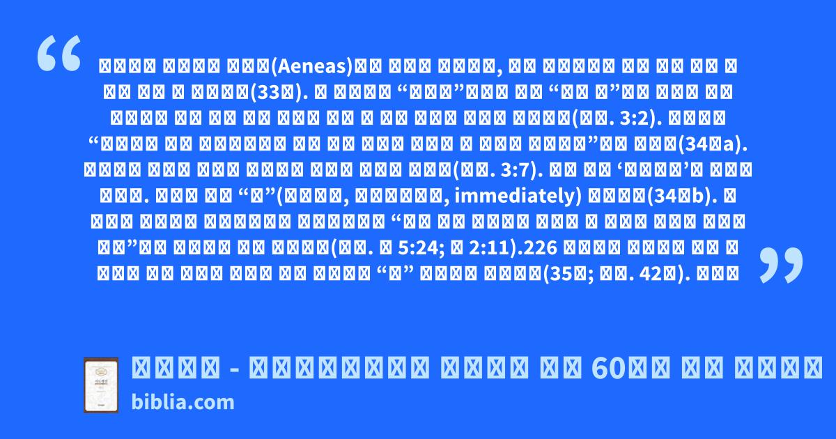 베드로는 룻다에서 애니아(Aeneas)라는 사람을 만나는데, 그는 중풍병으로 침상 위에 누운 지 여덟 해가 된 사람이다(33절). 이 구절에서 “중풍병”이라는 것과 “여덟 해”라는 단어가 같이 결합되어 있는 것은 그가 도저히 나을 수 없는 상태에 있음을 의미한다(참고. 3:2). 베드로는 “애니아야 예수 그리스도께서 너를 낫게 하시니 일어나 네 자리를 정돈하라”라고 말한다(34절a). 베드로는 별다른 행동을 취하거나 의식을 치르지 않는다(참고. 3:7). 그는 단지 ‘일어나라’고 명령할 뿐이다. 그러자 그가 “곧”(유떼오스, εὐθέως, immediately) 일어난다(34절b). 이 사건은 예수님이 가버나움에서 중풍병자에게 “내가 네게 이르노니 일어나 네 침상을 가지고 집으로 가라”라고 말씀하신 것을 떠올린다(참고. 눅 5:24; 막 2:11).226 베드로가 애니아를 고쳐 준 소식을 듣고 룻다와 사론에 사는 사람들이 “다” 주님께로 돌아온다(35절; 참고. 42절). 여기서