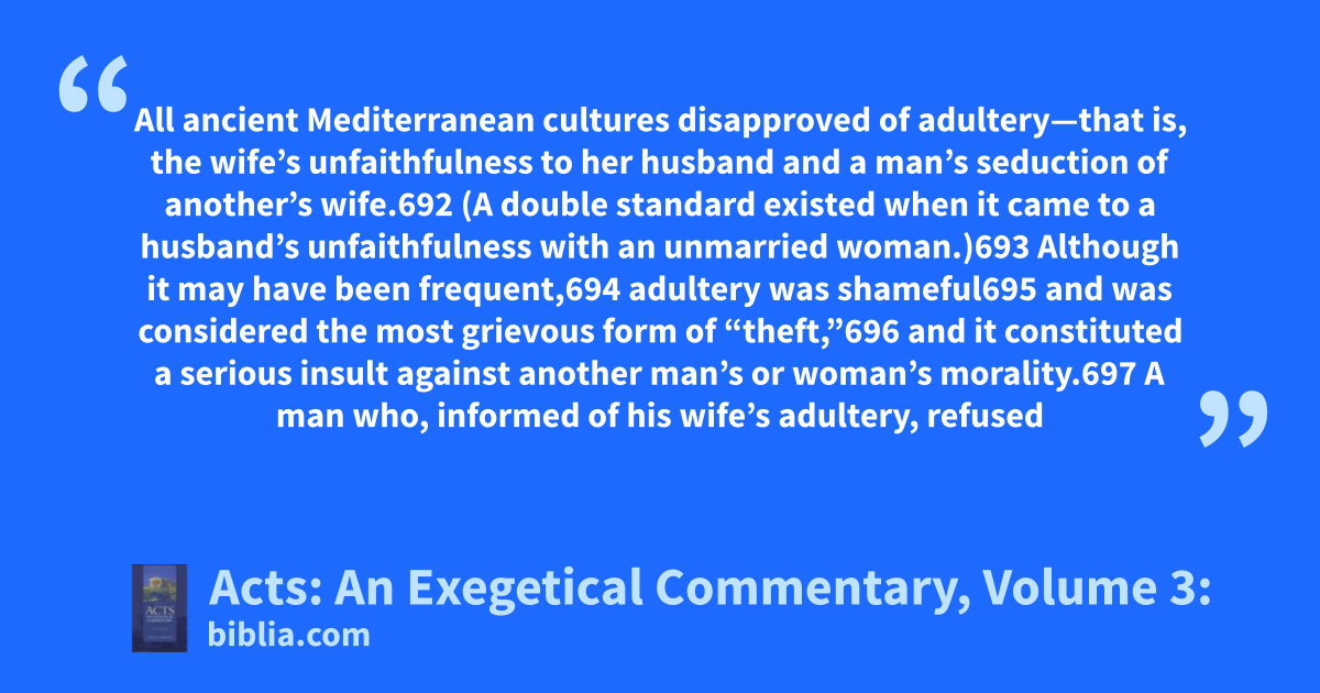 All ancient Mediterranean cultures disapproved of adultery—that is, the wife’s unfaithfulness to her husband and a man’s seduction of another’s wife.692 (A double standard existed when it came to a husband’s unfaithfulness with an unmarried woman.)693 Although it may have been frequent,694 adultery was shameful695 and was considered the most grievous form of “theft,”696 and it constituted a serious insult against another man’s or woman’s morality.697 A man who, informed of his wife’s adultery, refused