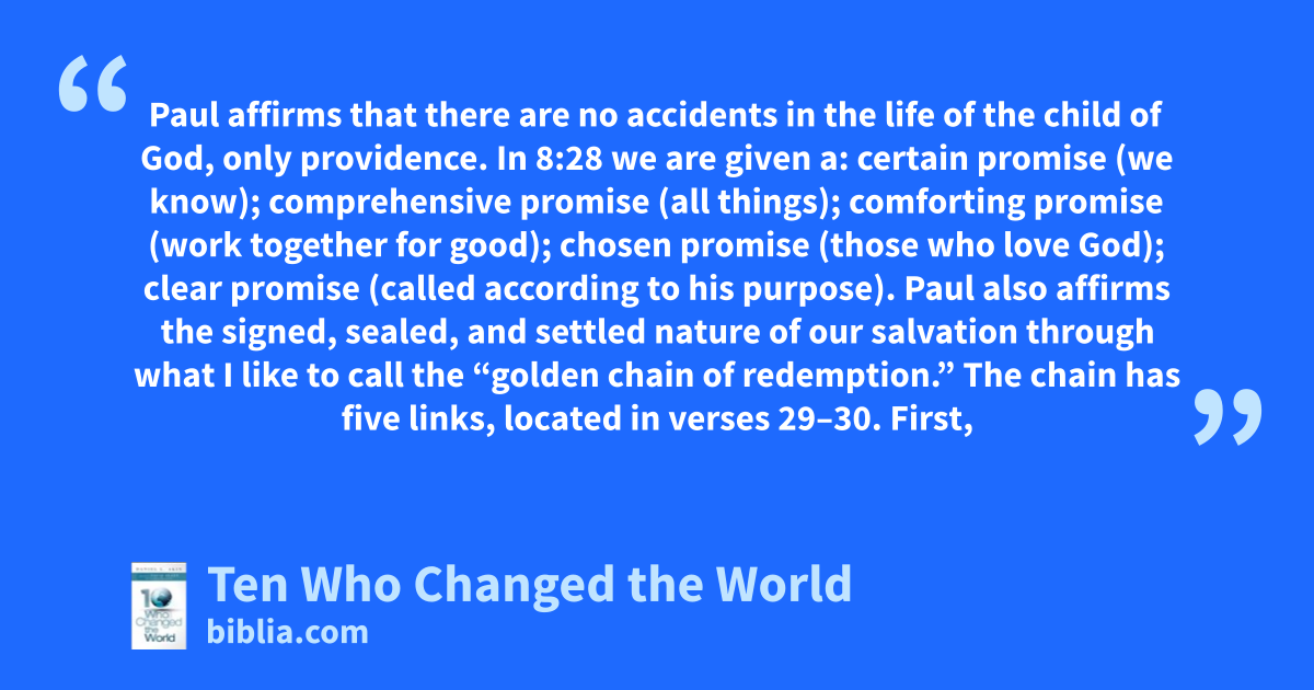 Paul affirms that there are no accidents in the life of the child of God, only providence. In 8:28 we are given a: certain promise (we know); comprehensive promise (all things); comforting promise (work together for good); chosen promise (those who love God); clear promise (called according to his purpose). Paul also affirms the signed, sealed, and settled nature of our salvation through what I like to call the “golden chain of redemption.” The chain has five links, located in verses 29–30. First,