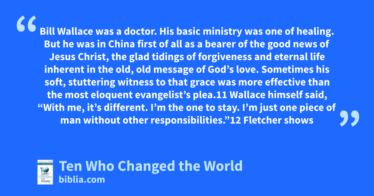 Bill Wallace was a doctor. His basic ministry was one of healing. But he was in China first of all as a bearer of the good news of Jesus Christ, the glad tidings of forgiveness and eternal life inherent in the old, old message of God’s love. Sometimes his soft, stuttering witness to that grace was more effective than the most eloquent evangelist’s plea.11 Wallace himself said, “With me, it’s different. I’m the one to stay. I’m just one piece of man without other responsibilities.”12 Fletcher shows