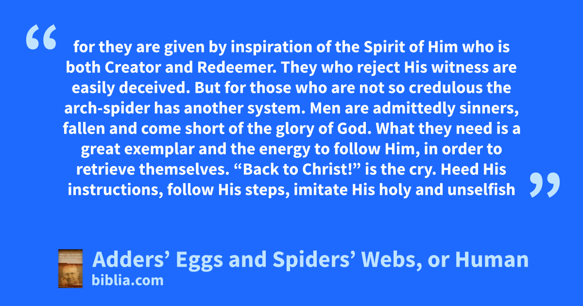 for they are given by inspiration of the Spirit of Him who is both Creator and Redeemer. They who reject His witness are easily deceived. But for those who are not so credulous the arch-spider has another system. Men are admittedly sinners, fallen and come short of the glory of God. What they need is a great exemplar and the energy to follow Him, in order to retrieve themselves. “Back to Christ!” is the cry. Heed His instructions, follow His steps, imitate His holy and unselfish