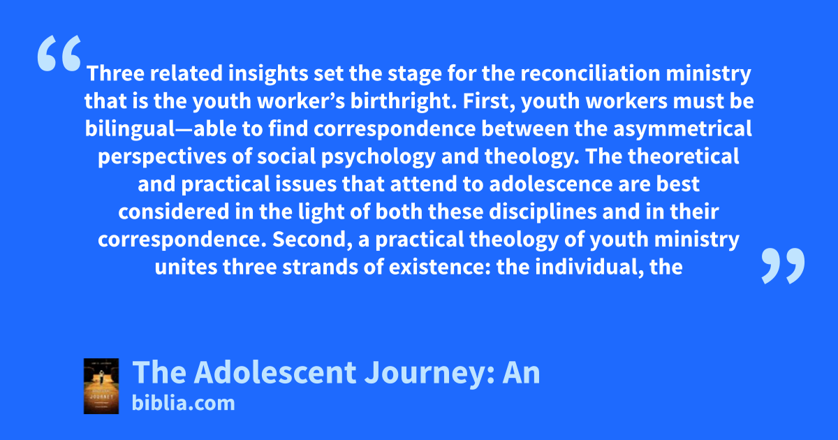 Three related insights set the stage for the reconciliation ministry that is the youth worker’s birthright. First, youth workers must be bilingual—able to find correspondence between the asymmetrical perspectives of social psychology and theology. The theoretical and practical issues that attend to adolescence are best considered in the light of both these disciplines and in their correspondence. Second, a practical theology of youth ministry unites three strands of existence: the individual, the