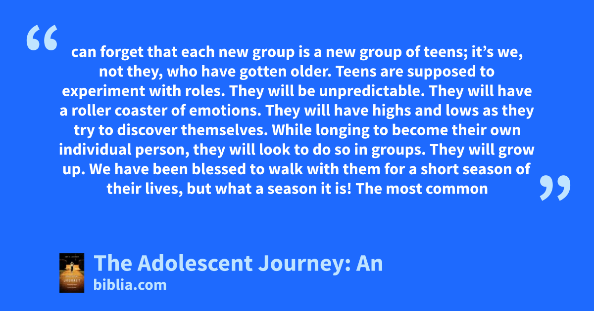can forget that each new group is a new group of teens; it’s we, not they, who have gotten older. Teens are supposed to experiment with roles. They will be unpredictable. They will have a roller coaster of emotions. They will have highs and lows as they try to discover themselves. While longing to become their own individual person, they will look to do so in groups. They will grow up. We have been blessed to walk with them for a short season of their lives, but what a season it is! The most common