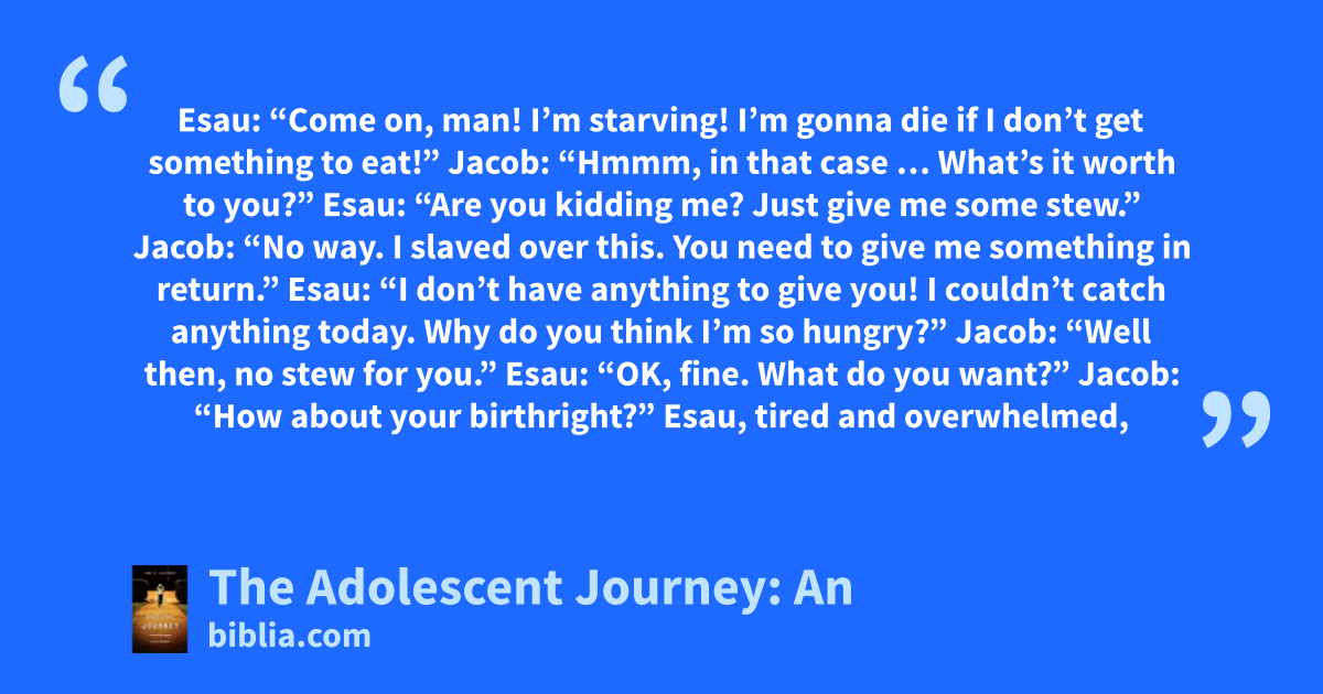 Esau: “Come on, man! I’m starving! I’m gonna die if I don’t get something to eat!” Jacob: “Hmmm, in that case … What’s it worth to you?” Esau: “Are you kidding me? Just give me some stew.” Jacob: “No way. I slaved over this. You need to give me something in return.” Esau: “I don’t have anything to give you! I couldn’t catch anything today. Why do you think I’m so hungry?” Jacob: “Well then, no stew for you.” Esau: “OK, fine. What do you want?” Jacob: “How about your birthright?” Esau, tired and overwhelmed,