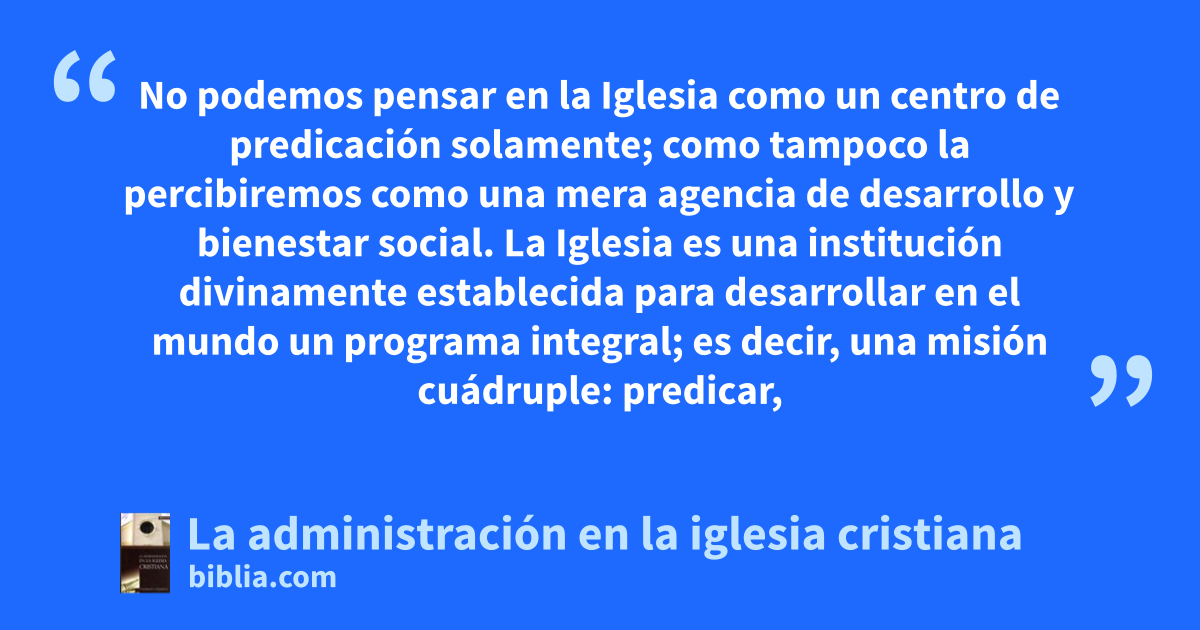 No podemos pensar en la Iglesia como un centro de predicación solamente; como tampoco la percibiremos como una mera agencia de desarrollo y bienestar social. La Iglesia es una institución divinamente establecida para desarrollar en el mundo un programa integral; es decir, una misión cuádruple: predicar,