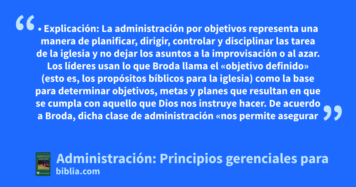 • Explicación: La administración por objetivos representa una manera de planificar, dirigir, controlar y disciplinar las tarea de la iglesia y no dejar los asuntos a la improvisación o al azar. Los líderes usan lo que Broda llama el «objetivo definido» (esto es, los propósitos bíblicos para la iglesia) como la base para determinar objetivos, metas y planes que resultan en que se cumpla con aquello que Dios nos instruye hacer. De acuerdo a Broda, dicha clase de administración «nos permite asegurar