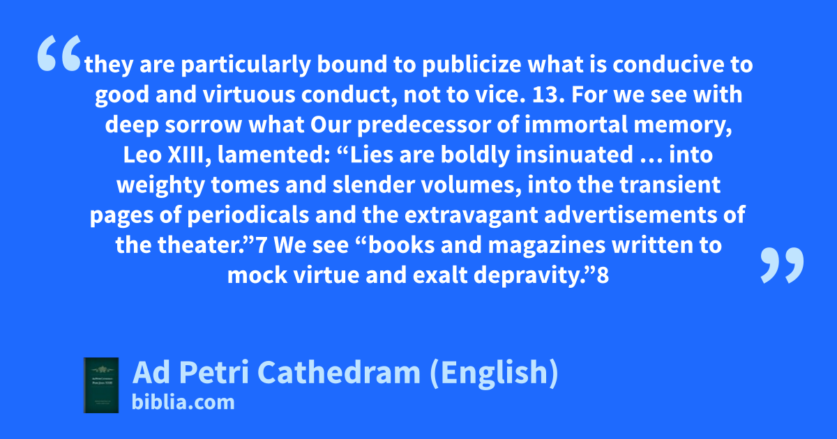 they are particularly bound to publicize what is conducive to good and virtuous conduct, not to vice. 13. For we see with deep sorrow what Our predecessor of immortal memory, Leo XIII, lamented: “Lies are boldly insinuated … into weighty tomes and slender volumes, into the transient pages of periodicals and the extravagant advertisements of the theater.”7 We see “books and magazines written to mock virtue and exalt depravity.”8