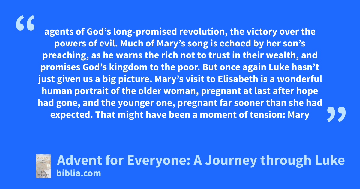 agents of God’s long-promised revolution, the victory over the powers of evil. Much of Mary’s song is echoed by her son’s preaching, as he warns the rich not to trust in their wealth, and promises God’s kingdom to the poor. But once again Luke hasn’t just given us a big picture. Mary’s visit to Elisabeth is a wonderful human portrait of the older woman, pregnant at last after hope had gone, and the younger one, pregnant far sooner than she had expected. That might have been a moment of tension: Mary