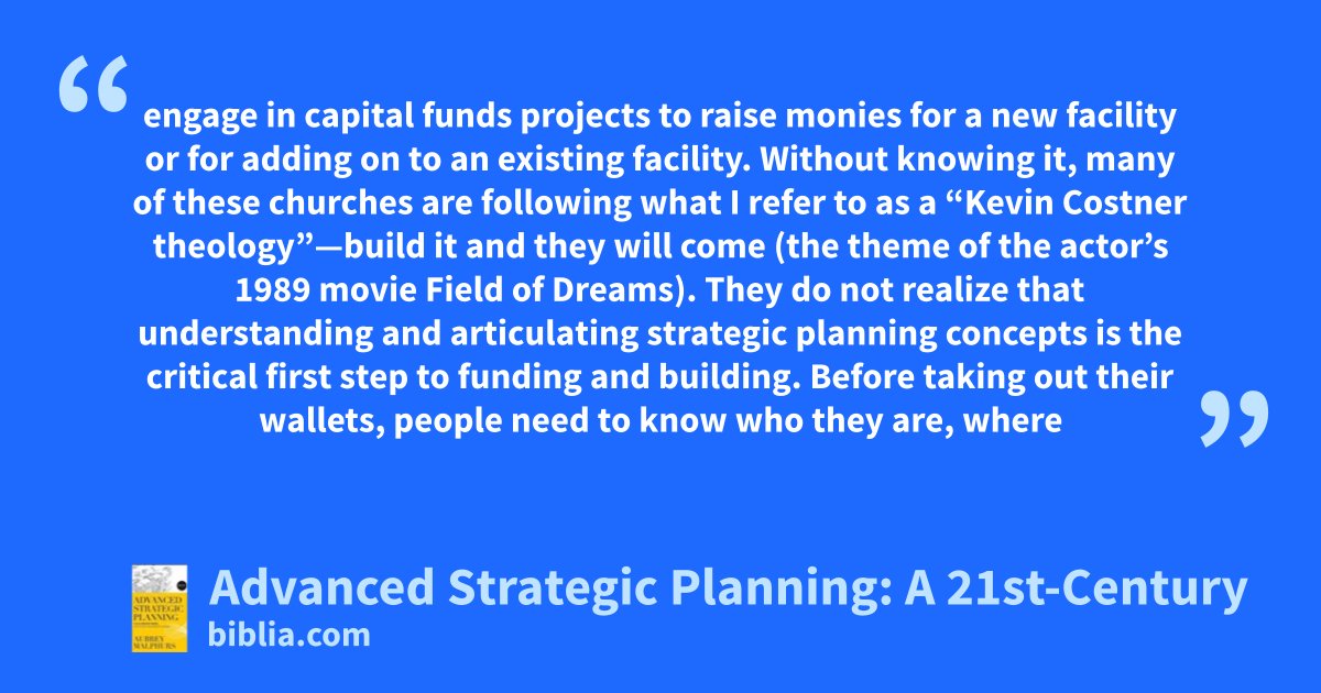 engage in capital funds projects to raise monies for a new facility or for adding on to an existing facility. Without knowing it, many of these churches are following what I refer to as a “Kevin Costner theology”—build it and they will come (the theme of the actor’s 1989 movie Field of Dreams). They do not realize that understanding and articulating strategic planning concepts is the critical first step to funding and building. Before taking out their wallets, people need to know who they are, where