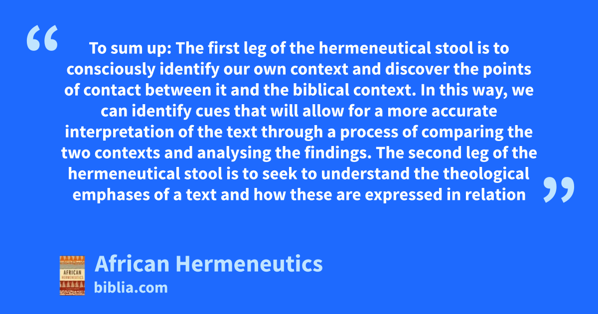 To sum up: The first leg of the hermeneutical stool is to consciously identify our own context and discover the points of contact between it and the biblical context. In this way, we can identify cues that will allow for a more accurate interpretation of the text through a process of comparing the two contexts and analysing the findings. The second leg of the hermeneutical stool is to seek to understand the theological emphases of a text and how these are expressed in relation