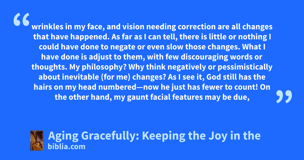 wrinkles in my face, and vision needing correction are all changes that have happened. As far as I can tell, there is little or nothing I could have done to negate or even slow those changes. What I have done is adjust to them, with few discouraging words or thoughts. My philosophy? Why think negatively or pessimistically about inevitable (for me) changes? As I see it, God still has the hairs on my head numbered—now he just has fewer to count! On the other hand, my gaunt facial features may be due,