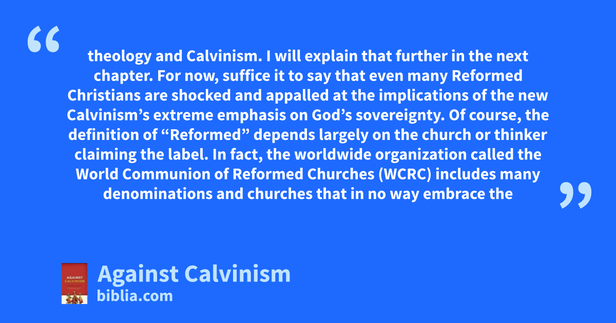theology and Calvinism. I will explain that further in the next chapter. For now, suffice it to say that even many Reformed Christians are shocked and appalled at the implications of the new Calvinism’s extreme emphasis on God’s sovereignty. Of course, the definition of “Reformed” depends largely on the church or thinker claiming the label. In fact, the worldwide organization called the World Communion of Reformed Churches (WCRC) includes many denominations and churches that in no way embrace the