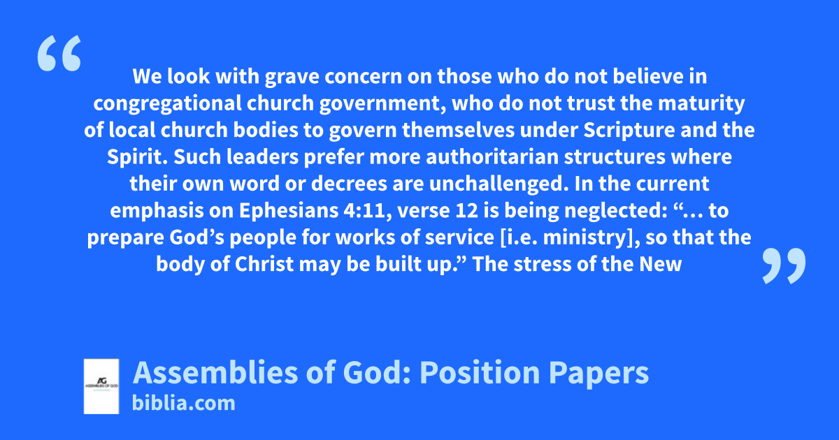 As the need arises to make a statement on a controversial issue, a study is done and a report given to the General Presbytery for approval as an official statement of The General Council of the Assemblies of God.