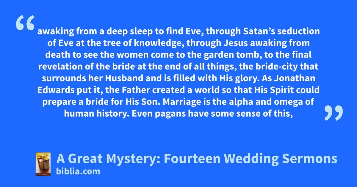 awaking from a deep sleep to find Eve, through Satan’s seduction of Eve at the tree of knowledge, through Jesus awaking from death to see the women come to the garden tomb, to the final revelation of the bride at the end of all things, the bride-city that surrounds her Husband and is filled with His glory. As Jonathan Edwards put it, the Father created a world so that His Spirit could prepare a bride for His Son. Marriage is the alpha and omega of human history. Even pagans have some sense of this,