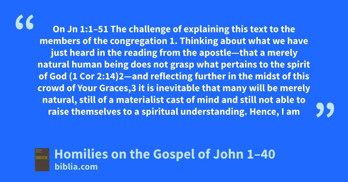 On Jn 1:1–51 The challenge of explaining this text to the members of the congregation 1. Thinking about what we have just heard in the reading from the apostle—that a merely natural human being does not grasp what pertains to the spirit of God (1 Cor 2:14)2—and reflecting further in the midst of this crowd of Your Graces,3 it is inevitable that many will be merely natural, still of a materialist cast of mind and still not able to raise themselves to a spiritual understanding. Hence, I am