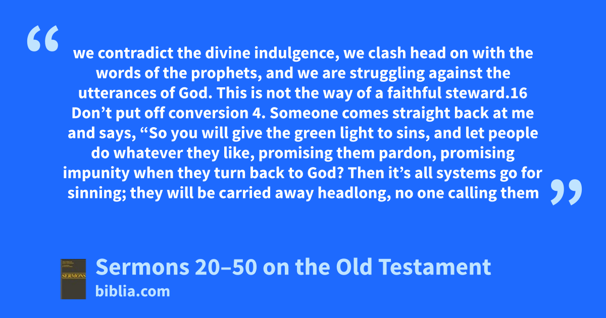 we contradict the divine indulgence, we clash head on with the words of the prophets, and we are struggling against the utterances of God. This is not the way of a faithful steward.16 Don’t put off conversion 4. Someone comes straight back at me and says, “So you will give the green light to sins, and let people do whatever they like, promising them pardon, promising impunity when they turn back to God? Then it’s all systems go for sinning; they will be carried away headlong, no one calling them