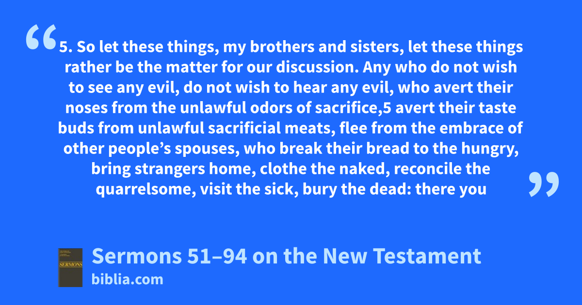 5. So let these things, my brothers and sisters, let these things rather be the matter for our discussion. Any who do not wish to see any evil, do not wish to hear any evil, who avert their noses from the unlawful odors of sacrifice,5 avert their taste buds from unlawful sacrificial meats, flee from the embrace of other people’s spouses, who break their bread to the hungry, bring strangers home, clothe the naked, reconcile the quarrelsome, visit the sick, bury the dead: there you
