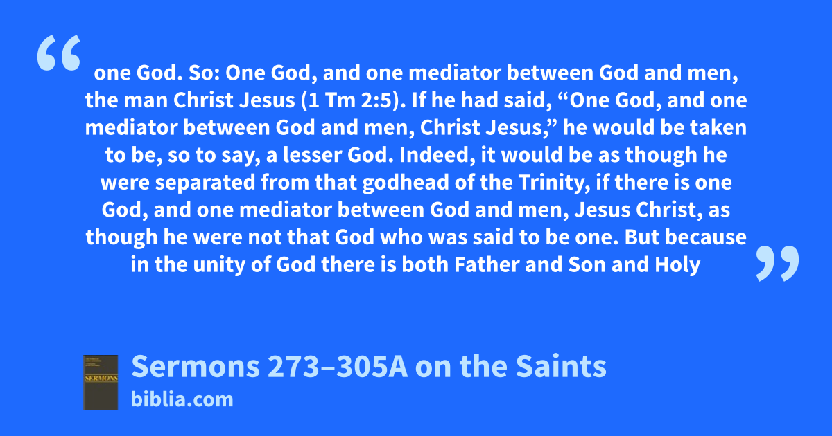 one God. So: One God, and one mediator between God and men, the man Christ Jesus (1 Tm 2:5). If he had said, “One God, and one mediator between God and men, Christ Jesus,” he would be taken to be, so to say, a lesser God. Indeed, it would be as though he were separated from that godhead of the Trinity, if there is one God, and one mediator between God and men, Jesus Christ, as though he were not that God who was said to be one. But because in the unity of God there is both Father and Son and Holy